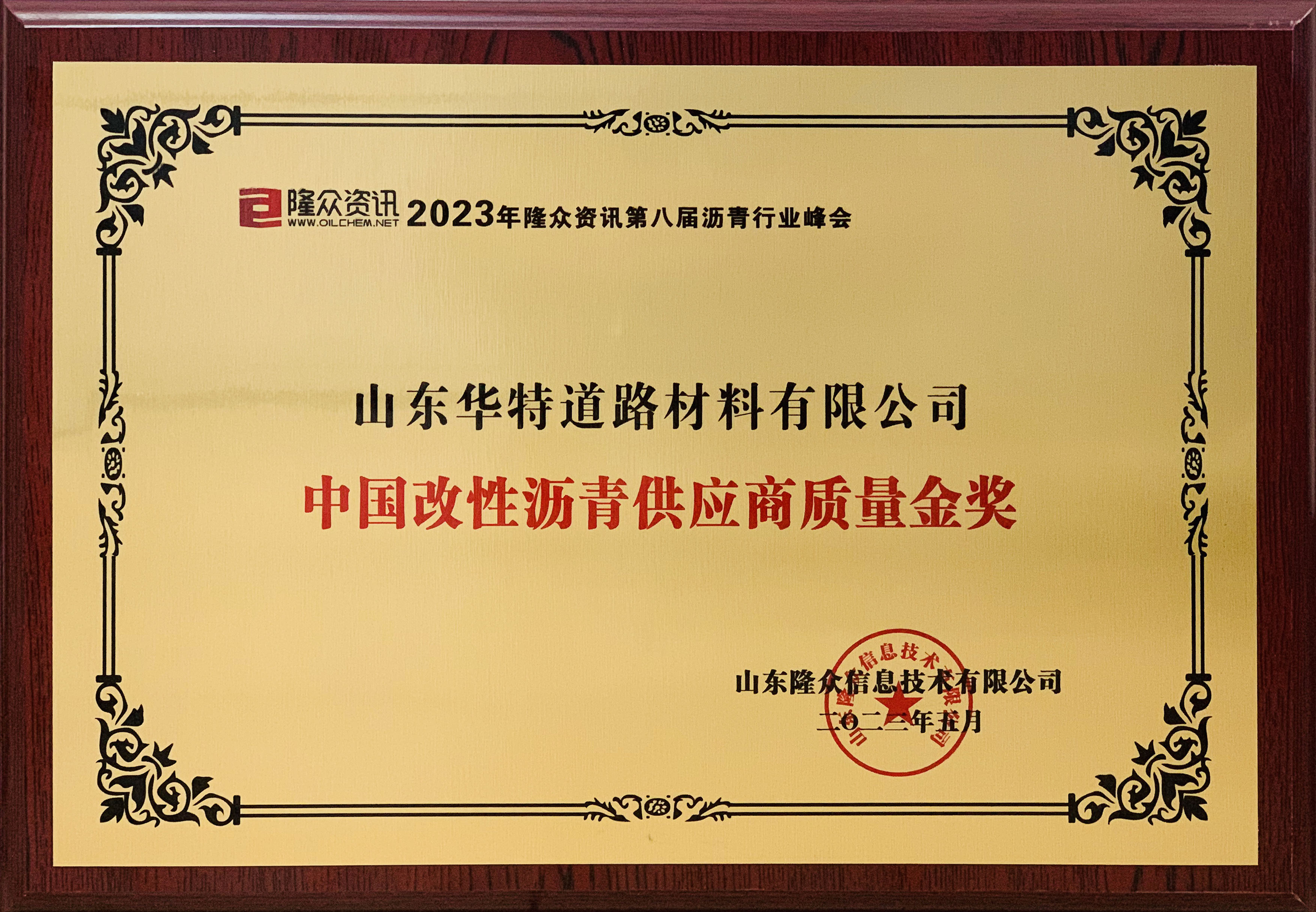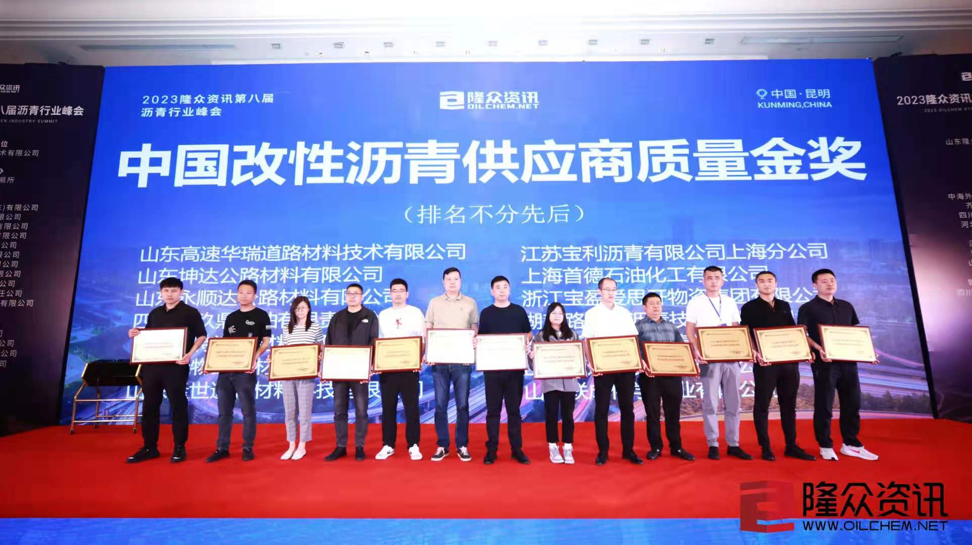 ??? 5月10日-11日,2023第八屆瀝青行業(yè)峰會(huì)在昆明隆重舉辦。山東華特道路材料有限公司受邀參加了本次會(huì)議,并榮獲“中國改性瀝青供應(yīng)商質(zhì)量金獎(jiǎng)”。